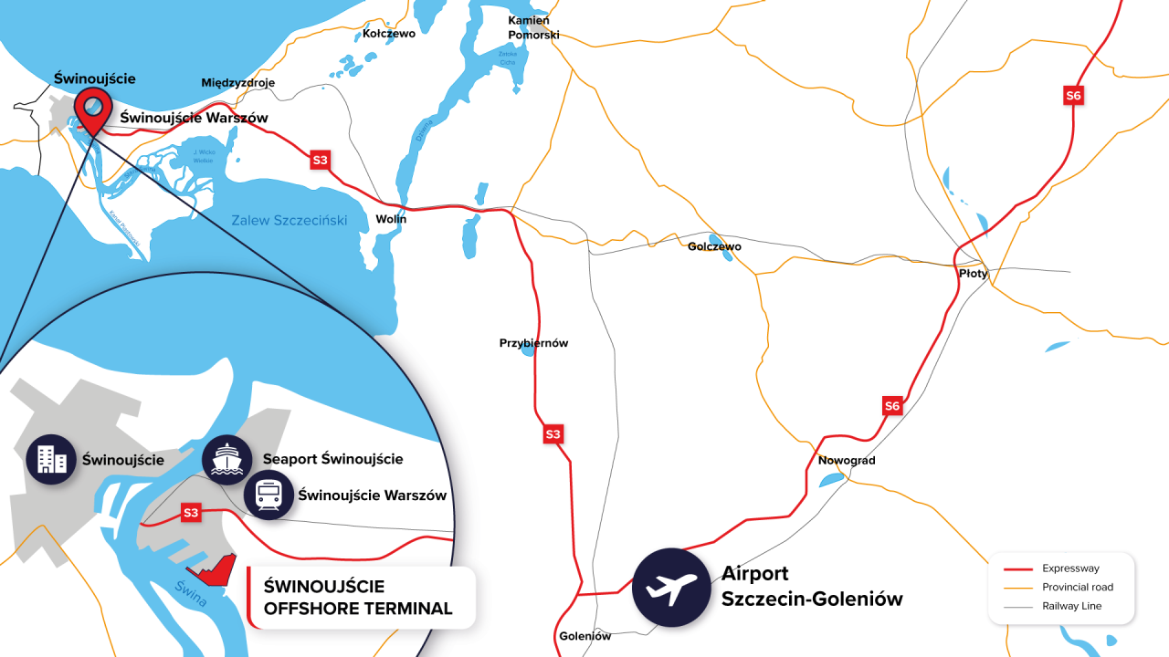 The terminal is located in the Port of Świnoujście in Western Pomerania. The excellent location provides convenient access by ferry, rail, air and road. It is located in the vicinity of the Polish-German border, which allows for servicing projects and suppliers in both countries. The location also allows for providing services for Scandinavian projects.